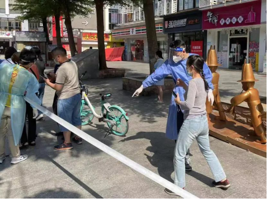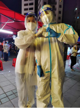晚上6点,结束了一天的社区支援后,齐宁和她的医生男友朱立鹏来到社区进行核酸检测,了解到现场需要支援后,两人就地化身“大白”,一人负责核酸采样,一人协助市民扫码登记,一直忙到凌晨12点。社区群众逐渐散去后,齐宁悄悄排到了核酸检测队列的最后,“看看我是谁!”只顾埋头采样的朱立鹏这才发现他今天最后一个受检者居然是自己的女友。两人相视会心一笑,一天的疲惫一扫而空,特殊时期的双向奔赴将是他们最特别的爱情记忆。
