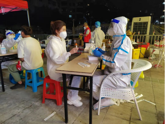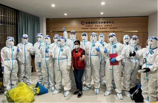 “害怕,真的很害怕,但我不能退缩!”4月12日晚上9:00,信用卡中心青年党员蔡智聪结束一天任务返回住宿点的路上,又接到一个新任务:立刻集合前往棠西南社区密接楼协助核酸检测工作。“这栋楼出现阳性人员,所有居民足不出户。”蔡智聪听完介绍后,虽在出发前和护士长学习了相关个人防护措施,但他还是怀着忐忑不安的心情踏进了密接楼,协助医护人员挨家挨户上门登记、扫码、捅喉咙……“当时真的很怕,谁也不知道这栋楼里其他住户的情况,万一还有阳性呢?”直到晚上11:00,蔡智聪与队友才完成密接楼50户居民的核酸检测工作。